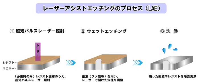 狭い範囲での深堀りを得意とする加工で穴加工・溝形状・流路など、超短パルスレーザーによるミクロン単位の加工等が可能になります。通常のレーザー加工と比べ、スループット・寸法安定性に優れます。レーザーを当てた後、薬液を用いた深堀エッチングです。