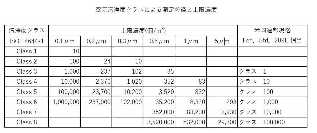 現在は国際統一規格ISO14644-1が制定され、1m^3中の粒径0.1μm以上の粒子数を規定しています。(1ft^3=0.02832m^3)